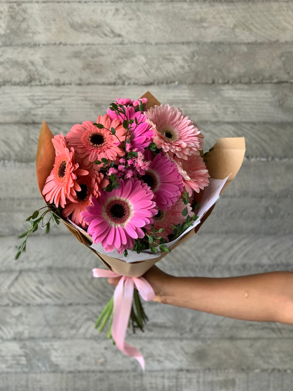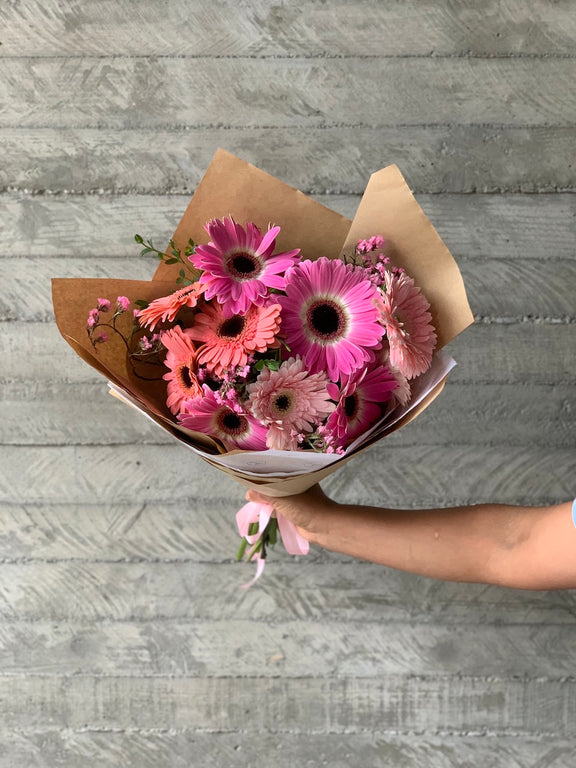 Este vibrante ramo está compuesto por gerberas en tonos de rosa pastel y rosa más intenso, complementado con parvifolia y statice. Disponible en tres tamaños, cada uno ofreciendo una cantidad diferente de gerberas para adaptarse a tus necesidades.